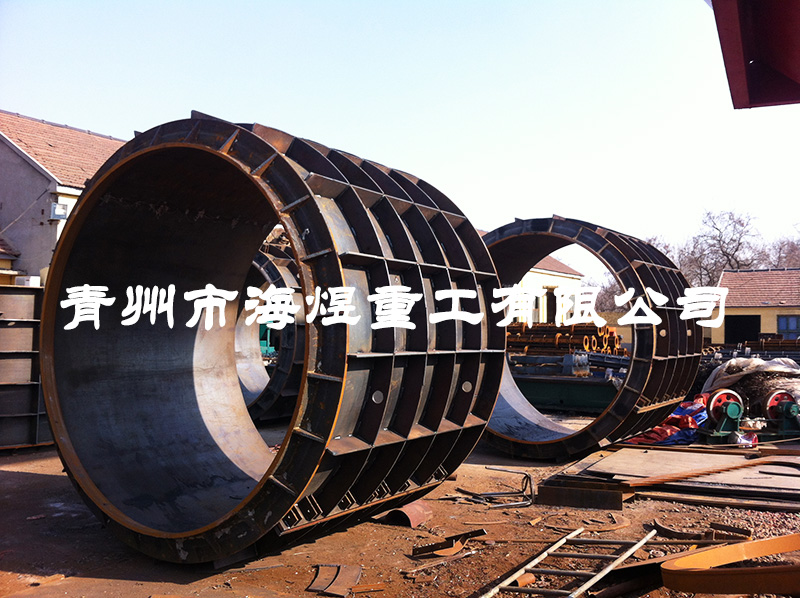 2400×2000水泥制管模具可用于生產(chǎn)柔性企口排水管,由于管徑較大,筒體厚度采用10mm,環(huán)筋、縱筋厚度分別為12,14mm;每套模具在出廠(chǎng)之前均用磨光機(jī)打磨內(nèi)部,使其光滑、圓順,保證成型管子的外觀(guān)質(zhì)量符合標(biāo)準(zhǔn)要求。