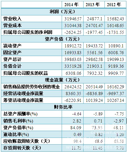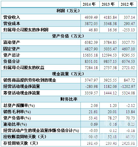從各項財務(wù)指標(biāo)的縱向?qū)Ρ葋砜矗?014年公司的盈利能力、資本結(jié)構(gòu)、償債能力及營運能力較2013年均有明顯好轉(zhuǎn),成長性可期。 中天管樁(832330.OC) 公司簡要介紹: 中天管樁成立于2007年,2007年底生產(chǎn)線投產(chǎn),2010年蕪湖第二條生產(chǎn)線建成投產(chǎn),2012年10月與偉星集團正式合作,2013年江蘇楊泰公司動工,2014年8月江蘇楊泰公司第一條全自動化生產(chǎn)線投產(chǎn)。2014年底完成股份制改革,2015年4月16日成功掛牌新三板。 公司控股股東為安徽偉星置業(yè)有限公司(由中國偉星集團、浙江偉星房地產(chǎn)開發(fā)有限公司共同投資組建),持股比例為40%,為公司實際控制人;公司董事監(jiān)事及高級管理人員持股31.8%。董事會7名成員中包括董事長在內(nèi)的4名成員曾就職于安徽偉星置業(yè),1名(總經(jīng)理)曾任建華管樁集團副總裁。偉星集團培養(yǎng)了兩個中小板上市公司--偉星股份和偉星新材,中天管樁新三板成功上市,可以大膽預(yù)測未來如果能夠成功跳入主板,將成為偉星集團旗下第三家上市公司。 公司財務(wù)狀況: 2014年公司由于新生產(chǎn)線的投產(chǎn),銷售收入大幅增長,但由于成本過高,歸屬母公司股東的凈利潤仍呈虧損狀態(tài)。截止到2014年底,公司流動負(fù)債高于流動資產(chǎn),短期償債風(fēng)險較高。