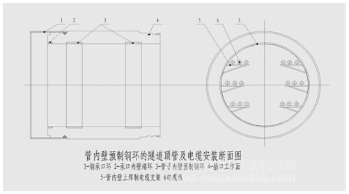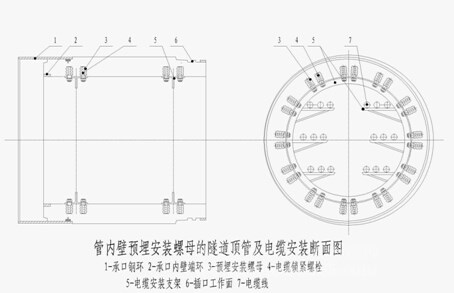 下圖就是預埋帶孔環(huán)形鋼板的隧道管節(jié)圖和安裝電纜的截面圖。