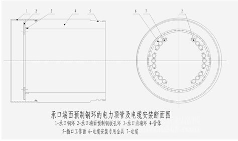 ◆首先,要保證鋼板環(huán)制作尺寸準確,環(huán)內徑與管子的內徑尺寸一致。 ◆裝模時要確保鋼板環(huán)安裝準確,有兩種較便于操作的方法: 其一,采用附加筋輔助定位,裝下部環(huán)時,在環(huán)外預先焊上數(shù)根縱向鋼筋,鋼筋長度以環(huán)邊到底托盤平面為準,將環(huán)套進內模,鋼筋端頭支撐在底盤上,再套進上部環(huán),上部環(huán)可依托下環(huán)為基準測量尺寸焊輔助筋定位,也可焊輔助筋向上彎腳掛在內模上,然后將內模安裝到位,裝鋼筋籠,兩只鋼環(huán)與鋼筋籠焊接牢固,再按正常工序制管即可。 其二,定位銷定位,在鋼模的內模上鉆孔,裝上定位銷,依托定位銷托承鋼板環(huán),待鋼板環(huán)與鋼筋籠焊接牢固后,將定位銷退后到與內模的外壁平整處,再按正常工序制管,這樣操作較前一方案簡便,可保證鋼板環(huán)與管內壁有較好的平整度。 第二種形式:端面預埋環(huán)形帶孔鋼板。 這種在電力電纜隧道內安裝電纜的方法是由湖北電力勘測設計院于2007年立項首創(chuàng)的電纜蛇形布設項目確定的,它的關鍵是在電纜隧道的管節(jié)的承口端面預埋圓周帶孔的環(huán)形鋼板,在地下隧道內安裝電纜時,用專用金屬夾具裝配在鋼環(huán)上,然后將電纜夾緊,這種方法安裝電纜很簡便、快捷,也可更有效利用隧道的空間。 ![]() ![]()