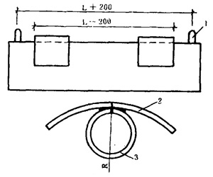 3. 然后用喂料機由B-B截面喂至D-D截面。如果是有筋管,為防止骨架產生扭曲變形,可在A-A截面布料結束后,先從C-C截面向D-D截面布料,最后從B-B截面向C-C截面布料,直至結束。 三、小口徑企口管的吊運與脫模 400-800mm的小口徑企口管,按GB11836國標規(guī)定,最小壁厚只有40mm,所以,企口部位的混凝土厚度是很小的。這樣小的厚度,如采用倒模方式脫模,勢必造成廢品或次品,為了解決這個問題,我們自行設計了一種專用脫模吊運工具(如圖2)。脫模時,在水泥管模具上半模起吊脫離后,把專用工具伸入管內,然后用行車起吊,即可使水泥管與下半模脫離。 ![]() 圖2 專用工具示意圖 1-水泥管公稱長度;R-水泥管外半徑;1-吊鉤;2-A3鋼板;δ=8-10mm;3-Φ74×鋼管;