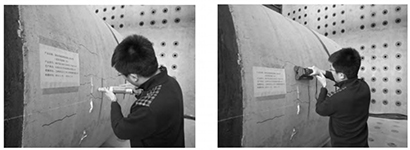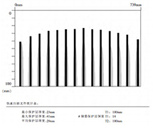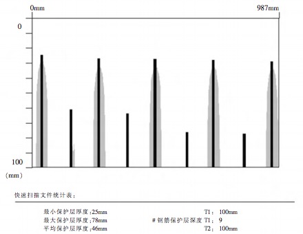 2.2 混凝土強(qiáng)度及鋼筋信息檢測(cè) 混凝土強(qiáng)度采用回彈儀進(jìn)行檢測(cè),水泥管鋼筋數(shù)量、間距及保護(hù)層厚度采用PS200鋼筋探測(cè)儀進(jìn)行檢測(cè),F(xiàn)場(chǎng)無(wú)損檢測(cè)情況見(jiàn)圖 3、圖 4,圖5為雙層縱筋保護(hù)層厚度、間距、鋼筋掃描圖像,圖中縱坐標(biāo)為保護(hù)層厚度,橫坐標(biāo)為鋼筋間距,線條為鋼筋圖像。 ![]() 圖3 回彈法檢測(cè)混凝土強(qiáng)度 圖4 鋼筋信息檢測(cè) 由于水泥管縱筋及環(huán)向鋼筋在管內(nèi)、外側(cè)均雙層配置,因此,內(nèi)外鋼筋位置、保護(hù)層等信息以圖像高低不同進(jìn)行區(qū)分,即圖像較高(保護(hù)層厚度較。橥鈧(cè)鋼筋。 ![]() ![]() 圖5 雙層縱筋保護(hù)層厚度、間距、鋼筋圖像 圖6 環(huán)向鋼筋分布 圖6為環(huán)向鋼筋信息掃描圖像,因鋼筋探測(cè)儀根據(jù)電磁感應(yīng)原理工作,檢測(cè)時(shí)探頭應(yīng)垂直于鋼筋位置,而水泥管的環(huán)向鋼筋與縱軸線有一定傾斜角度,故鋼筋檢測(cè)掃描圖像中縱坐標(biāo)保護(hù)層厚度非直線,說(shuō)明保護(hù)層厚度因角度不同存在偏差,但呈對(duì)稱分布,中間最高處為環(huán)向筋實(shí)際保護(hù)層厚度,水泥管混凝土強(qiáng)度及鋼筋檢測(cè)結(jié)果見(jiàn)表2。