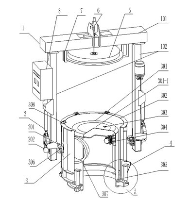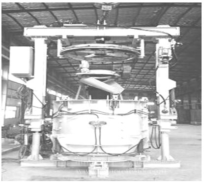 三、高頻振動(dòng)成型、垂直翻轉(zhuǎn)、一體脫模管井成型工藝及裝備 為克服以上幾種管井成型工藝的缺點(diǎn),一種“高頻振動(dòng)成型、垂直翻轉(zhuǎn)、內(nèi)外一體立即脫模的管井生產(chǎn)工藝”由“蘇州科星混凝土裝備公司”提出設(shè)想,并研發(fā)了相應(yīng)的工藝裝備(圖6、圖7),對(duì)此生產(chǎn)工藝及裝備進(jìn)行了中試驗(yàn)證,生產(chǎn)的連底¢1000-2000檢查井井室及¢1000-1500檢查井井筒混凝土密實(shí)度好、生產(chǎn)效率高、工藝方法簡(jiǎn)捷、裝備造價(jià)低、生產(chǎn)適應(yīng)性強(qiáng)(可成型¢1000-2000范圍內(nèi)的檢查井井室、井筒、排水管) ![]() 圖6 ![]() 圖7