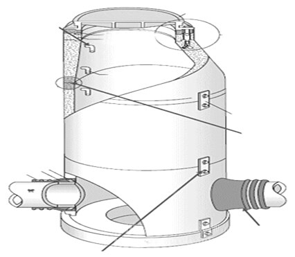 由于澆注成型工藝生產(chǎn)成本高、達(dá)標(biāo)產(chǎn)能模具用量及費(fèi)用巨大等原因,一般不用該工藝方式生產(chǎn)常規(guī)的批量預(yù)制混凝土檢查井。 2.離心或懸輥成型工藝 排水管生產(chǎn)企業(yè)利用原有的水泥管模具,成型檢查井的井筒部分,是一種經(jīng)濟(jì)有效的方法。但井室采用二次成型拼裝會(huì)影響產(chǎn)品質(zhì)量,井室?guī)Э祝x心或懸輥成型時(shí)轉(zhuǎn)速不到位或跳模,成品不密實(shí)且易發(fā)安全事故;如筒身與底板間灌入細(xì)石混凝土或砂漿,則由于二者界面收縮不一,產(chǎn)生裂縫;(圖3)如筒身與底板間采用膠圈、柔性企口,加以筒、底間預(yù)埋張緊連接,產(chǎn)品成本增加。(圖4) ![]() 圖3 ![]() 圖4
