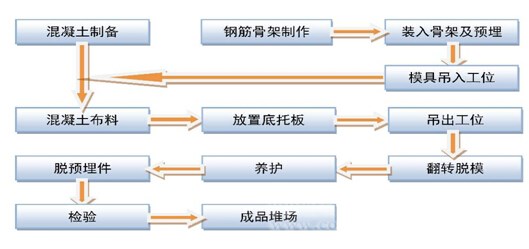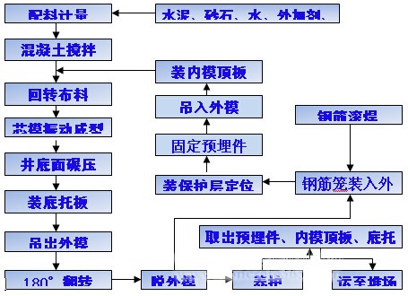 工藝步驟:1.成型模具內(nèi)放置排水管孔預(yù)埋件;2.吊至模具在工作坑內(nèi)或地面就位;3.混凝土布料、高頻振動(dòng)成型;4.混凝土達(dá)到井室底厚度時(shí),放置井室底板并與模具連接;5.成品及模具提起180°翻轉(zhuǎn);6.脫模;7.養(yǎng)護(hù);8.脫去排水管孔預(yù)埋件;9.至成品堆場(chǎng)。 工藝流程圖: ![]()