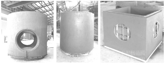 1.澆注成型或加輔助振動(dòng)的澆注成型工藝 澆注成型工藝的優(yōu)點(diǎn)為成型工藝簡(jiǎn)單、產(chǎn)品形狀規(guī)格大小可按模具任意成型、小批量生產(chǎn)靈活、產(chǎn)品外觀光滑。但相對(duì)立即脫模的高頻振動(dòng)成型工藝方式,缺點(diǎn)為規(guī)模生產(chǎn)時(shí)模具投入大、產(chǎn)能小、工人勞動(dòng)強(qiáng)度大,原輔材料、人工及其它生產(chǎn)成本高。 混凝土檢查井型號(hào)規(guī)格繁多,同時(shí)每套檢查井由不同的部件組成。以輸水檢查井為例,一套完整的預(yù)制裝配式混凝土檢查井由井室(檢查井主體,接排水管的受水部分)、井室頂板(井室與井筒間的過(guò)渡及收口)、井筒(控制檢查井高度及豎向通道,一般不過(guò)水)、收口板或收口圈(檢查井與井蓋間收口)、調(diào)節(jié)圈(微調(diào)檢查井高度)等組成(圖2)!额A(yù)制混凝土檢查井》行業(yè)標(biāo)準(zhǔn)(JC/T2241-2014)中光井室平面尺寸規(guī)格品種就有21種之多,每種規(guī)格品種配上2-3種高度,設(shè)計(jì)部門(mén)有50多種井室的選擇余地。 ![]() 圖2